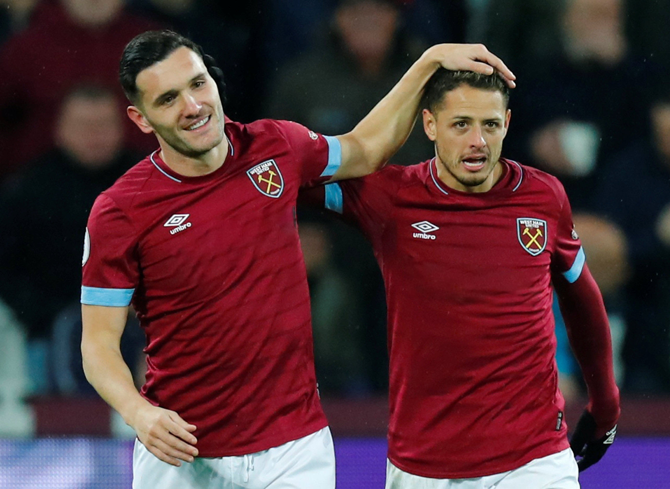 Soccer Football – Premier League – West Ham United v Cardiff City – London Stadium, London, Britain – December 4, 2018 West Ham’s Lucas Perez celebrates scoring their first goal with Javier Hernandez REUTERS/Eddie Keogh EDITORIAL USE ONLY. No use with unauthorized audio, video, data, fixture lists, club/league logos or “live” services. Online in-match use limited to 75 images, no video emulation. No use in betting, games or single club/league/player publications. Please contact your account representative for further details.