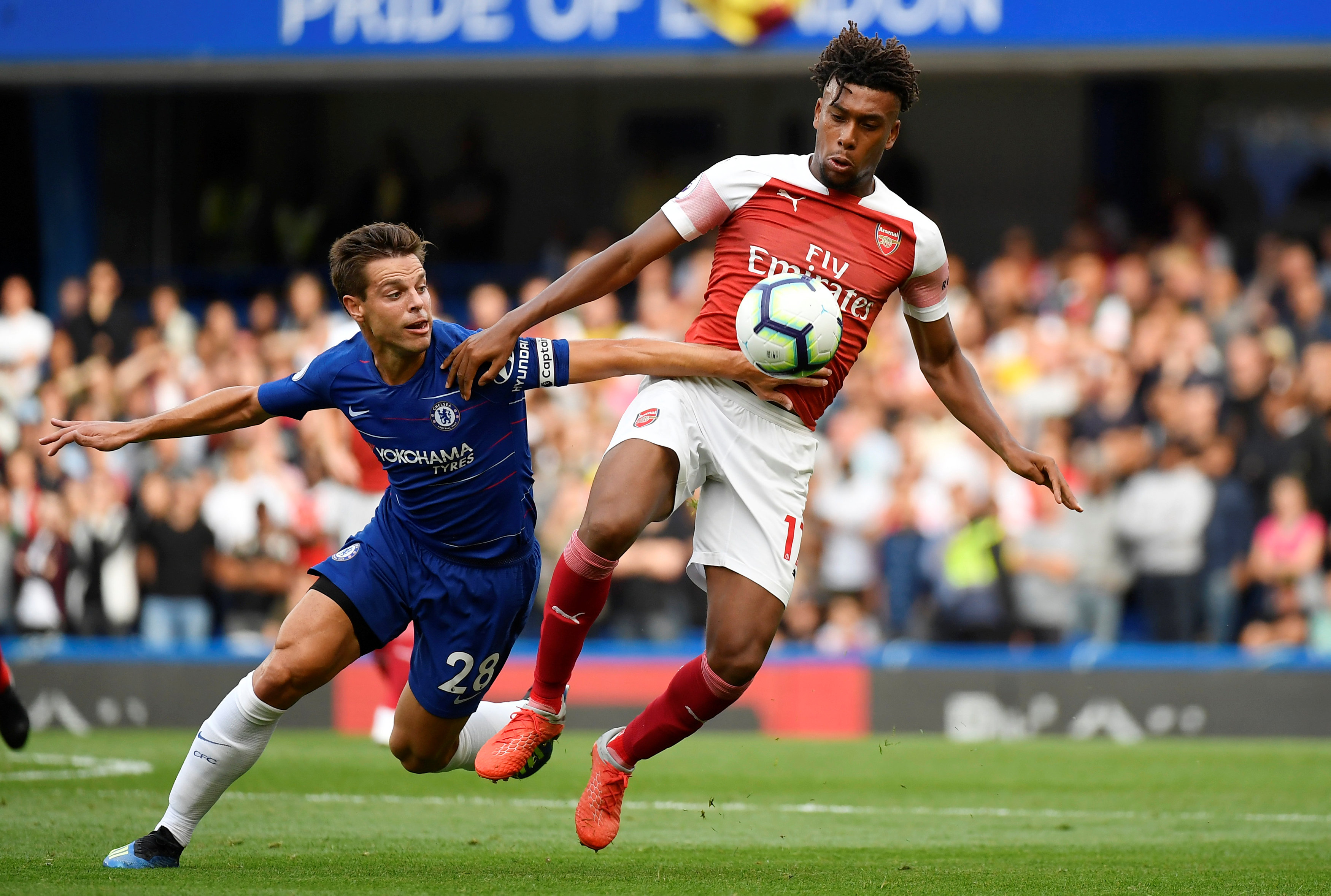 Soccer Football – Premier League – Chelsea v Arsenal – Stamford Bridge, London, Britain – August 18, 2018 Chelsea’s Cesar Azpilicueta in action with Arsenal’s Alex Iwobi REUTERS/Toby Melville EDITORIAL USE ONLY. No use with unauthorized audio, video, data, fixture lists, club/league logos or “live” services. Online in-match use limited to 75 images, no video emulation. No use in betting, games or single club/league/player publications. Please contact your account representative for further details.