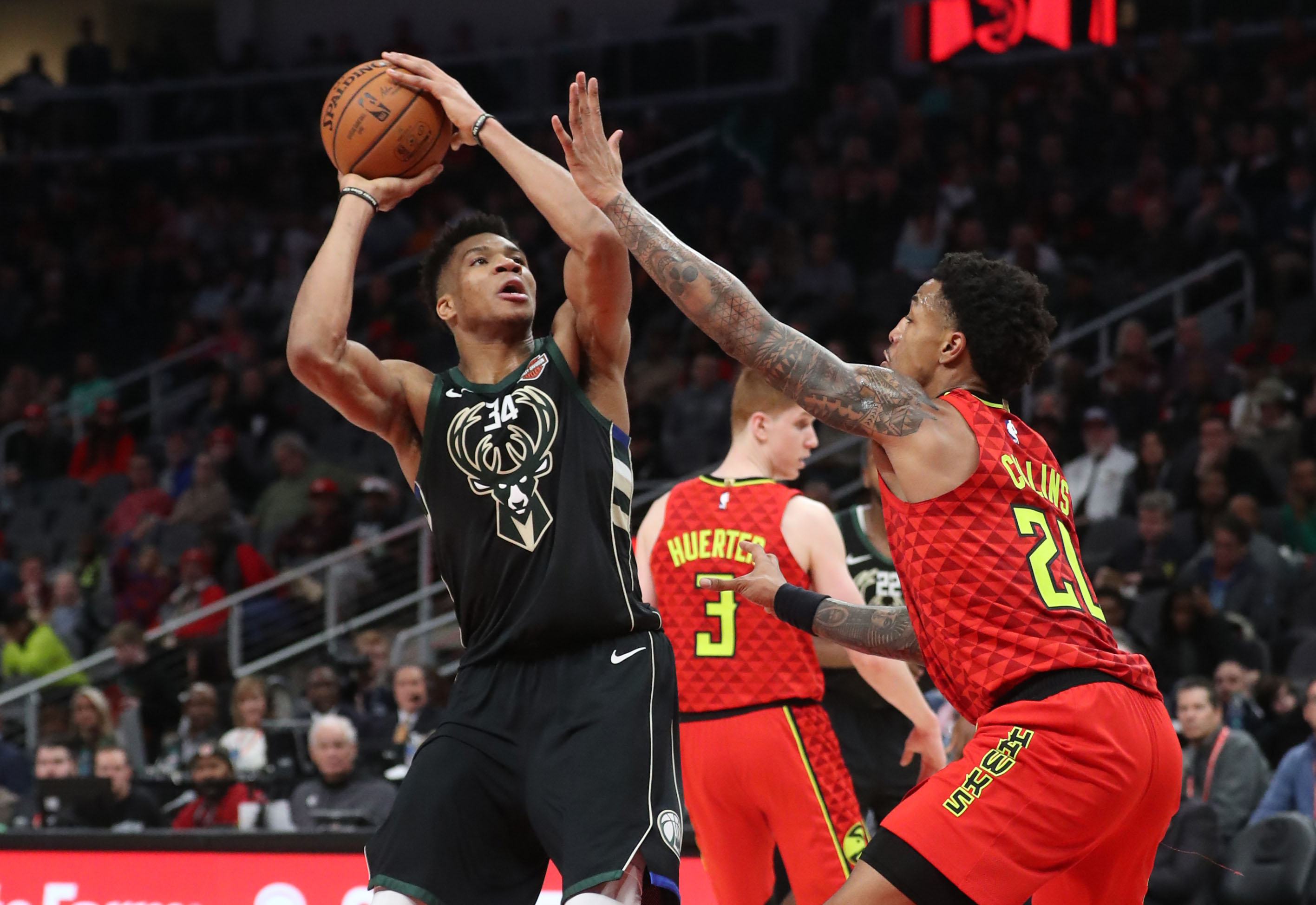 NBA: Milwaukee Bucks at Atlanta Hawks Jan 13, 2019; Atlanta, GA, USA; Milwaukee Bucks forward Giannis Antetokounmpo (34) attempts a shot against Atlanta Hawks forward John Collins (20) in the second half at State Farm Arena. Mandatory Credit: Jason Getz-USA TODAY Sports