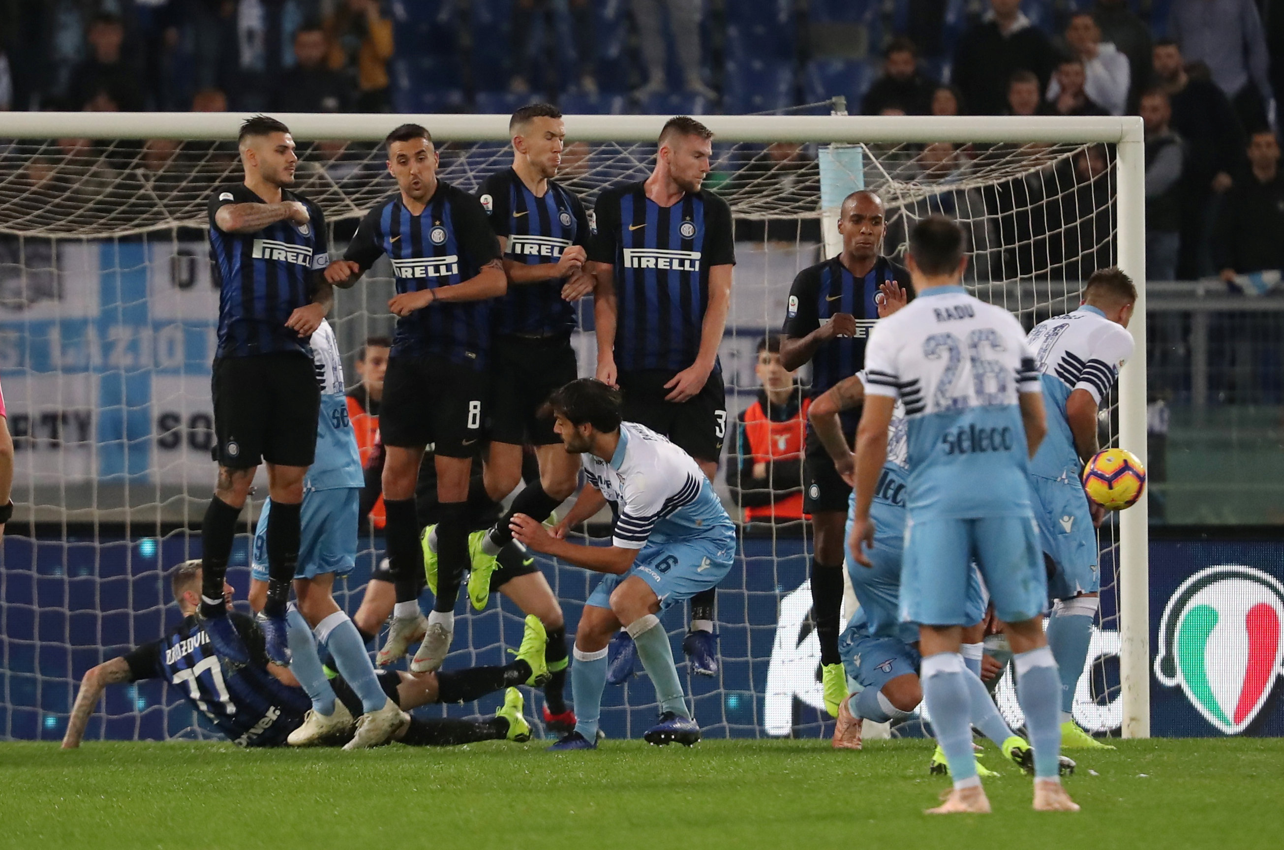 Serie A – Lazio v Inter Milan Soccer Football – Serie A – Lazio v Inter Milan – Stadio Olimpico, Rome, Italy – October 29, 2018 Inter Milan’s Matias Vecino and team mates in a defensive wall as Lazio take a free-kick REUTERS/Tony Gentile