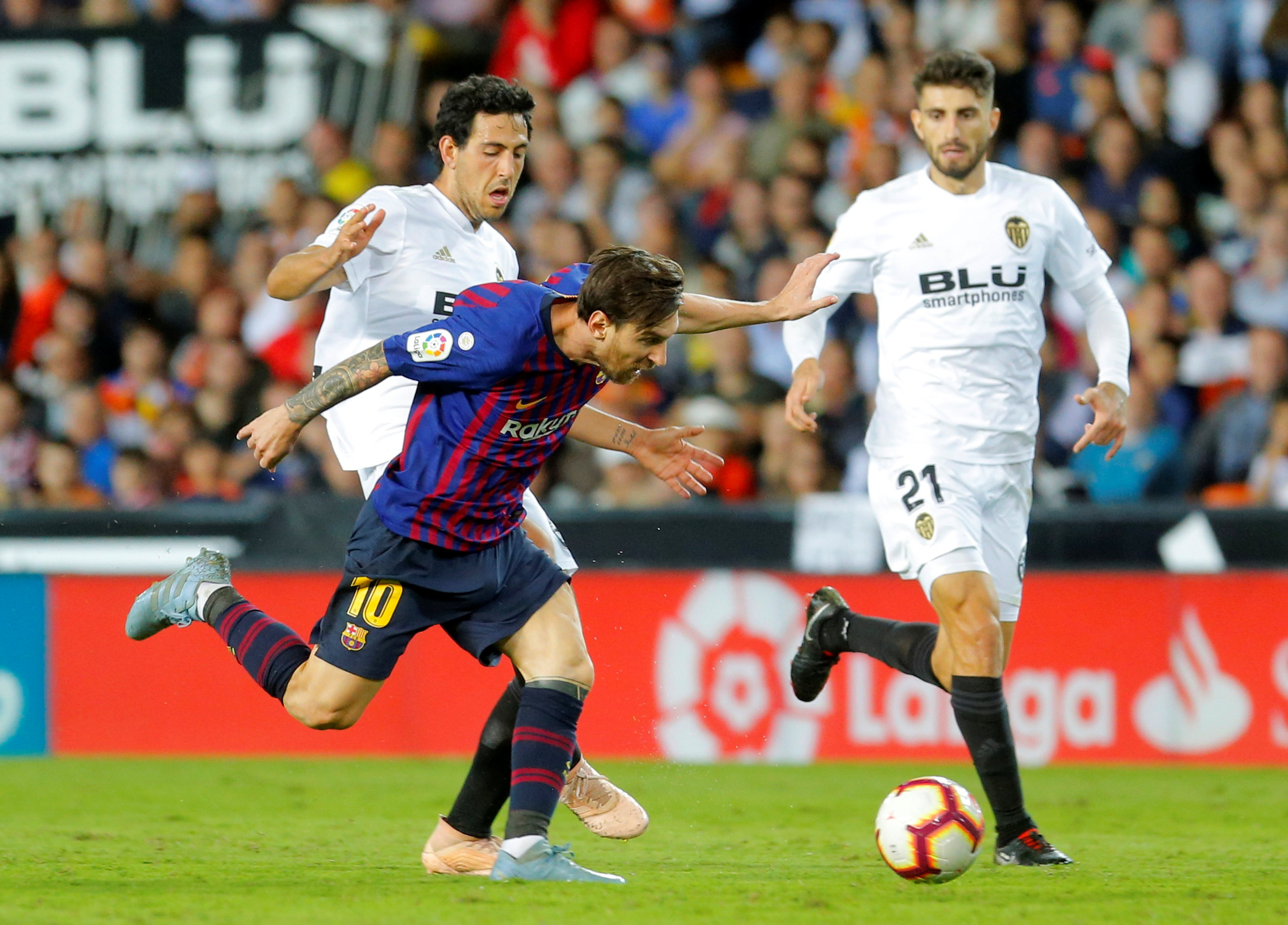 La Liga Santander – Valencia v FC Barcelona Soccer Football – La Liga Santander – Valencia v FC Barcelona – Mestalla, Valencia, Spain – October 7, 2018 Barcelona’s Lionel Messi in action with Valencia’s Dani Parejo REUTERS/Heino Kalis