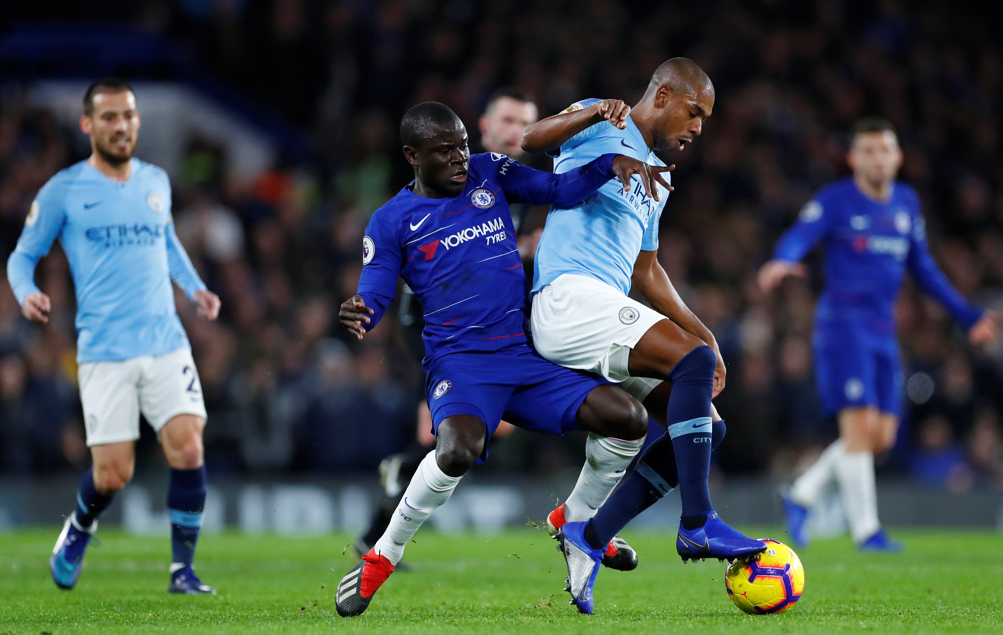 Soccer Football – Premier League – Chelsea v Manchester City – Stamford Bridge, London, Britain – December 8, 2018 Chelsea’s N’Golo Kante in action with Manchester City’s Fernandinho REUTERS/Eddie Keogh EDITORIAL USE ONLY. No use with unauthorized audio, video, data, fixture lists, club/league logos or “live” services. Online in-match use limited to 75 images, no video emulation. No use in betting, games or single club/league/player publications. Please contact your account representative for further details.