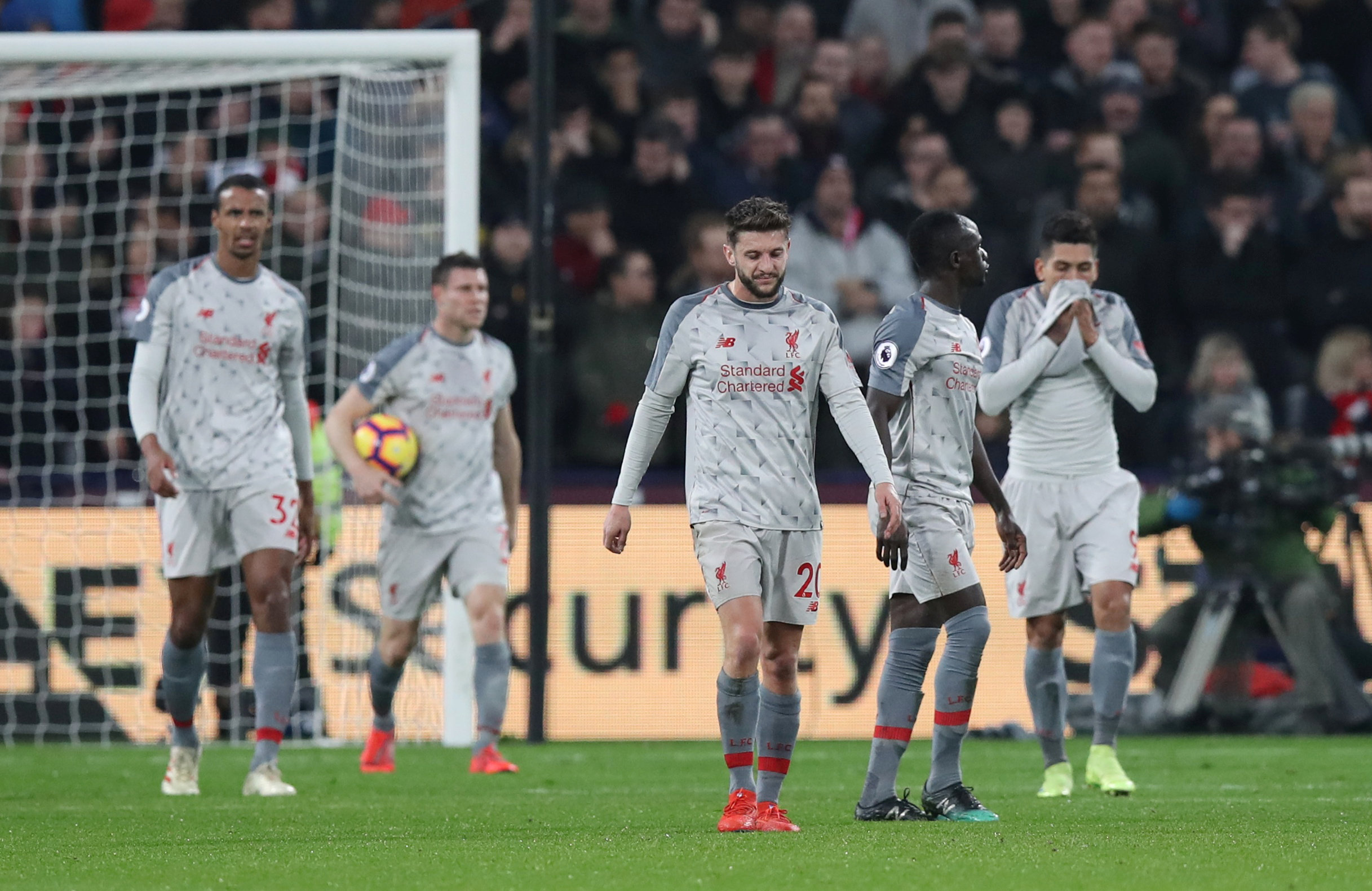 Soccer Football – Premier League – West Ham United v Liverpool – London Stadium, London, Britain – February 4, 2019 Liverpool’s Adam Lallana, James Milner and team mates react after conceding their first goal scored by West Ham’s Michail Antonio REUTERS/David Klein EDITORIAL USE ONLY. No use with unauthorized audio, video, data, fixture lists, club/league logos or “live” services. Online in-match use limited to 75 images, no video emulation. No use in betting, games or single club/league/player publications. Please contact your account representative for further details.