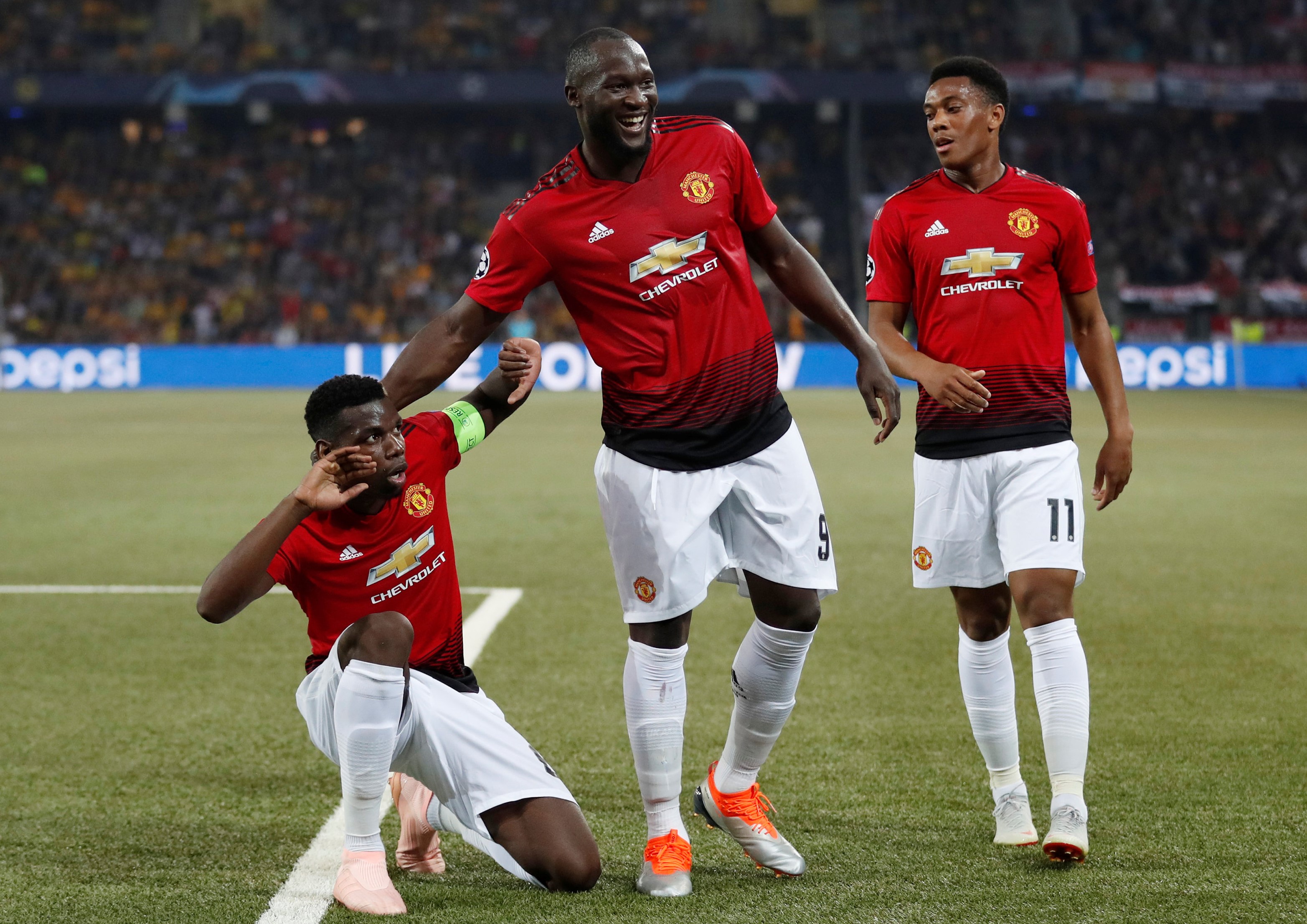 Soccer Football – Champions League – Group Stage – Group H – BSC Young Boys v Manchester United – Stade de Suisse, Bern, Switzerland – September 19, 2018 Manchester United’s Paul Pogba celebrates with Romelu Lukaku and Anthony Martial after scoring their first goal Action Images via Reuters/Matthew Childs