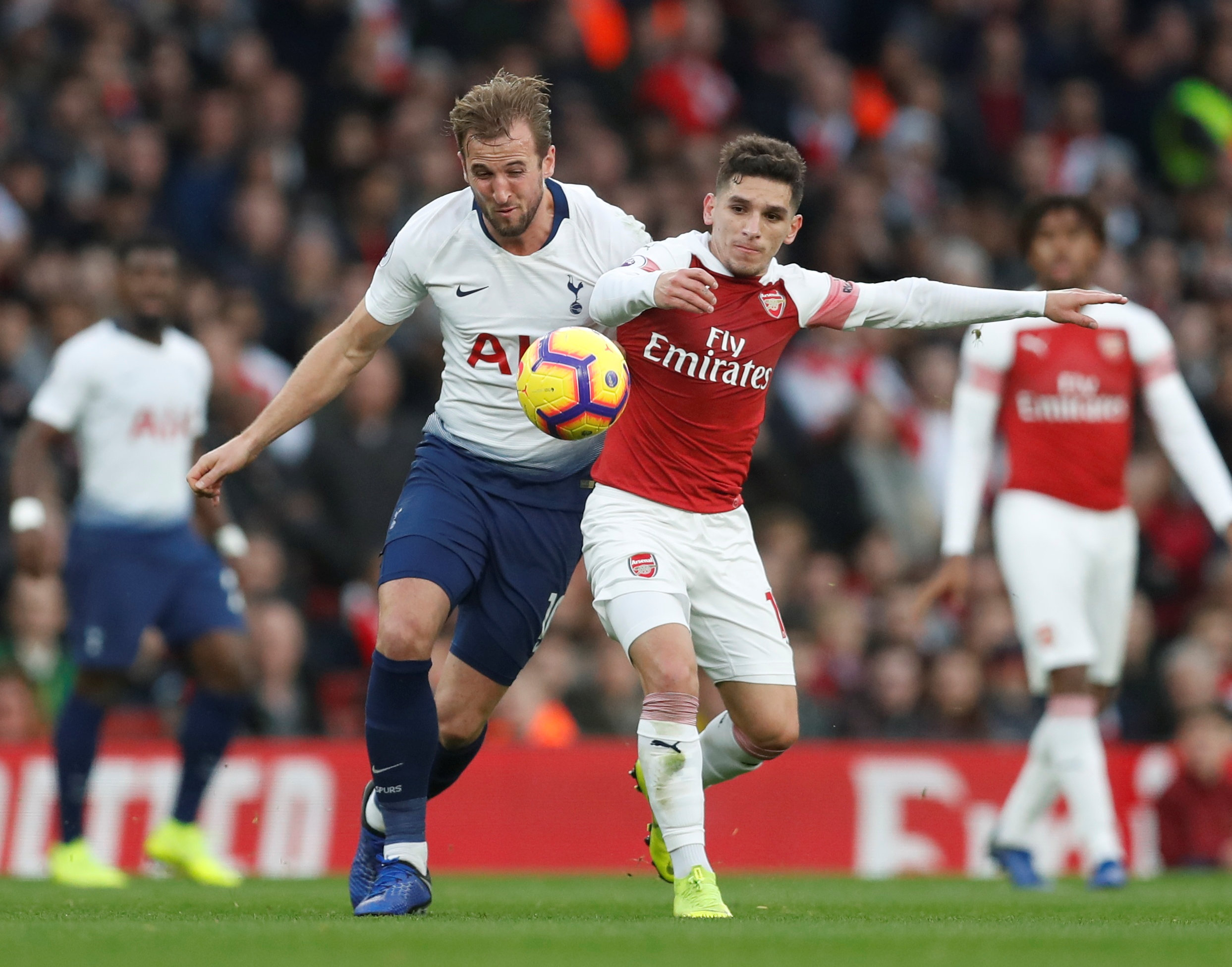Soccer Football – Premier League – Arsenal v Tottenham Hotspur – Emirates Stadium, London, Britain – December 2, 2018 Tottenham’s Harry Kane in action with Arsenal’s Lucas Torreira Action Images via Reuters/Matthew Childs EDITORIAL USE ONLY. No use with unauthorized audio, video, data, fixture lists, club/league logos or “live” services. Online in-match use limited to 75 images, no video emulation. No use in betting, games or single club/league/player publications. Please contact your account representative for further details.