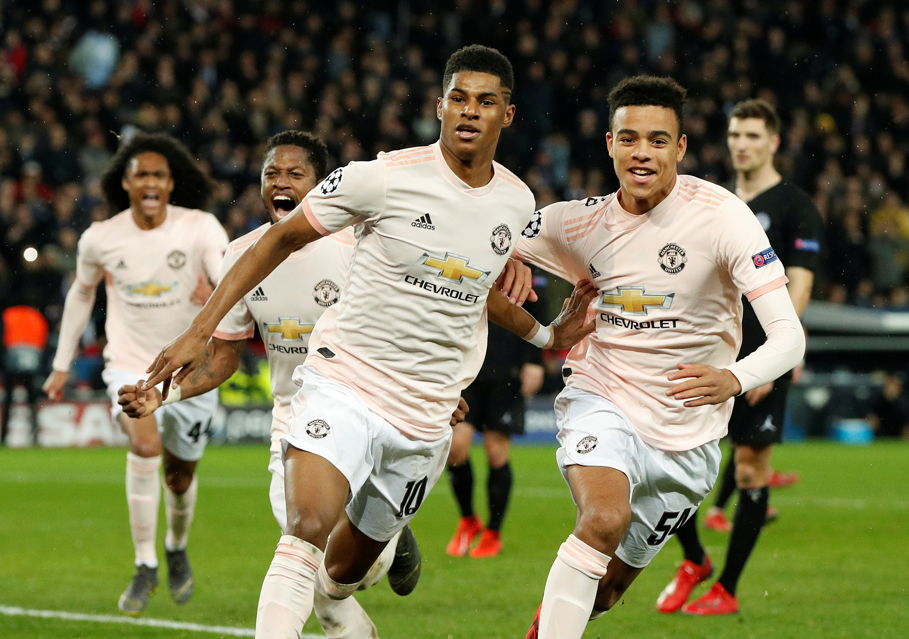 Soccer Football – Champions League – Round of 16 Second Leg – Paris St Germain v Manchester United – Parc des Princes, Paris, France – March 6, 2019 Manchester United’s Marcus Rashford celebrates scoring their third goal with Mason Greenwood and Fred Action Images via Reuters/John Sibley