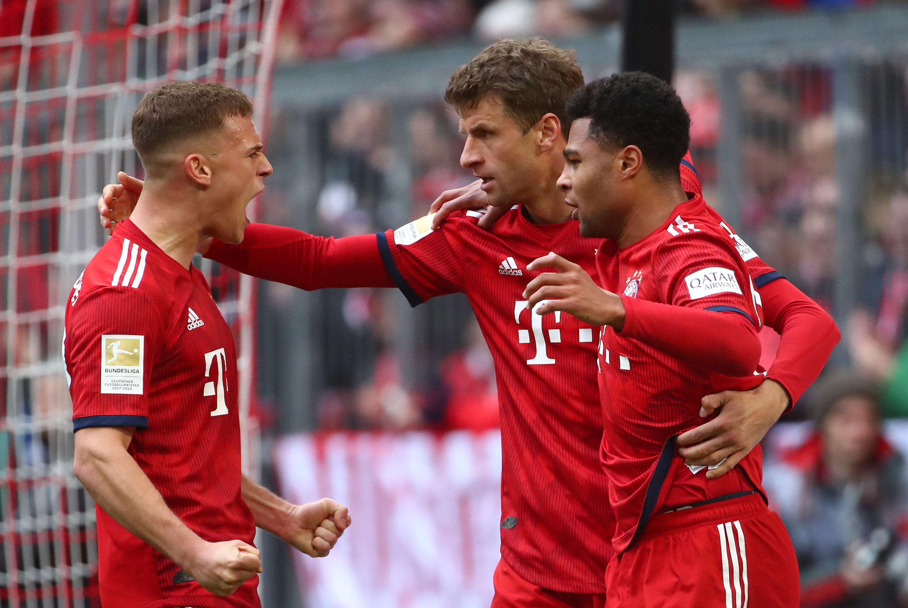 Soccer Football – Bundesliga – Bayern Munich v VfL Wolfsburg – Allianz Arena, Munich, Germany – March 9, 2019 Bayern Munich’s Serge Gnabry celebrates scoring their first goal with Thomas Mueller and Joshua Kimmich REUTERS/Michael Dalder DFL regulations prohibit any use of photographs as image sequences and/or quasi-video