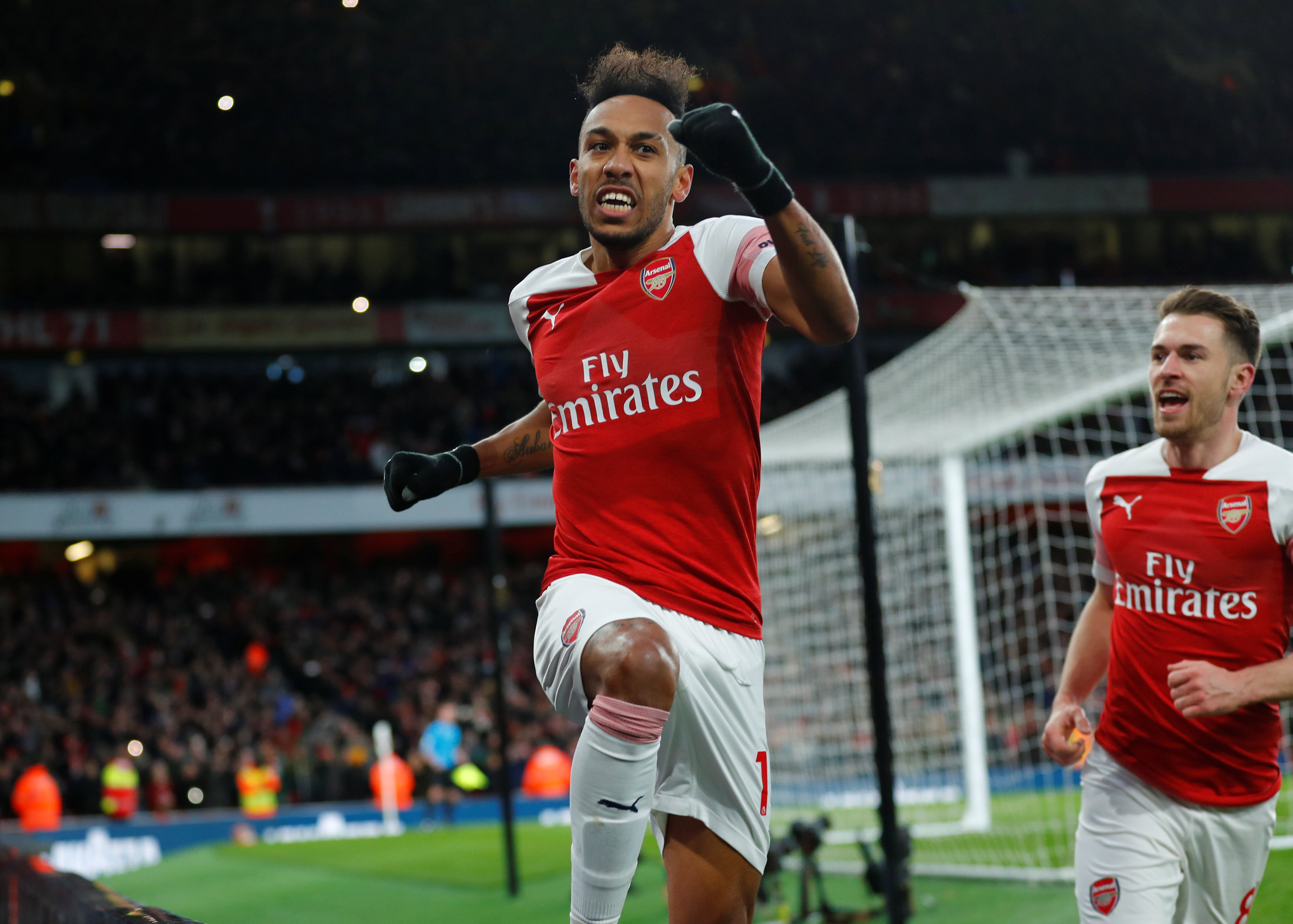 Soccer Football – Premier League – Arsenal v Manchester United – Emirates Stadium, London, Britain – March 10, 2019 Arsenal’s Pierre-Emerick Aubameyang celebrates scoring their second goal REUTERS/Eddie Keogh EDITORIAL USE ONLY. No use with unauthorized audio, video, data, fixture lists, club/league logos or “live” services. Online in-match use limited to 75 images, no video emulation. No use in betting, games or single club/league/player publications. Please contact your account representative for further details.