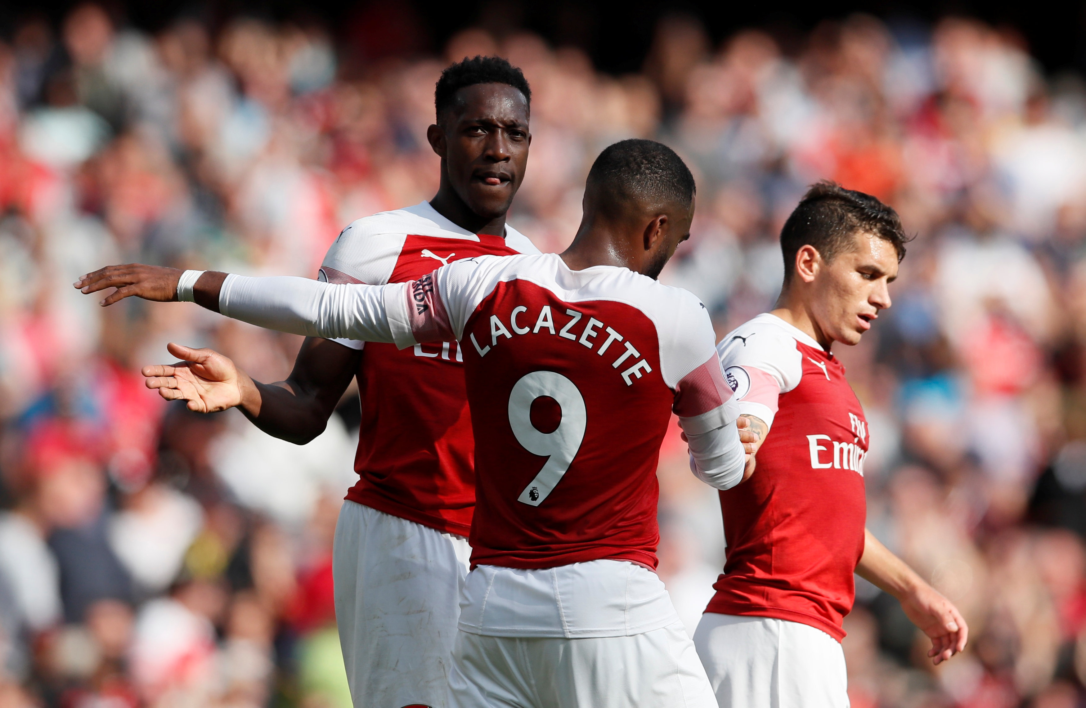 Soccer Football – Premier League – Arsenal v West Ham United – Emirates Stadium, London, Britain – August 25, 2018 Arsenal’s Danny Welbeck celebrates scoring their third goal with Alexandre Lacazette and Lucas Torreira REUTERS/David Klein EDITORIAL USE ONLY. No use with unauthorized audio, video, data, fixture lists, club/league logos or “live” services. Online in-match use limited to 75 images, no video emulation. No use in betting, games or single club/league/player publications. Please contact your account representative for further details.