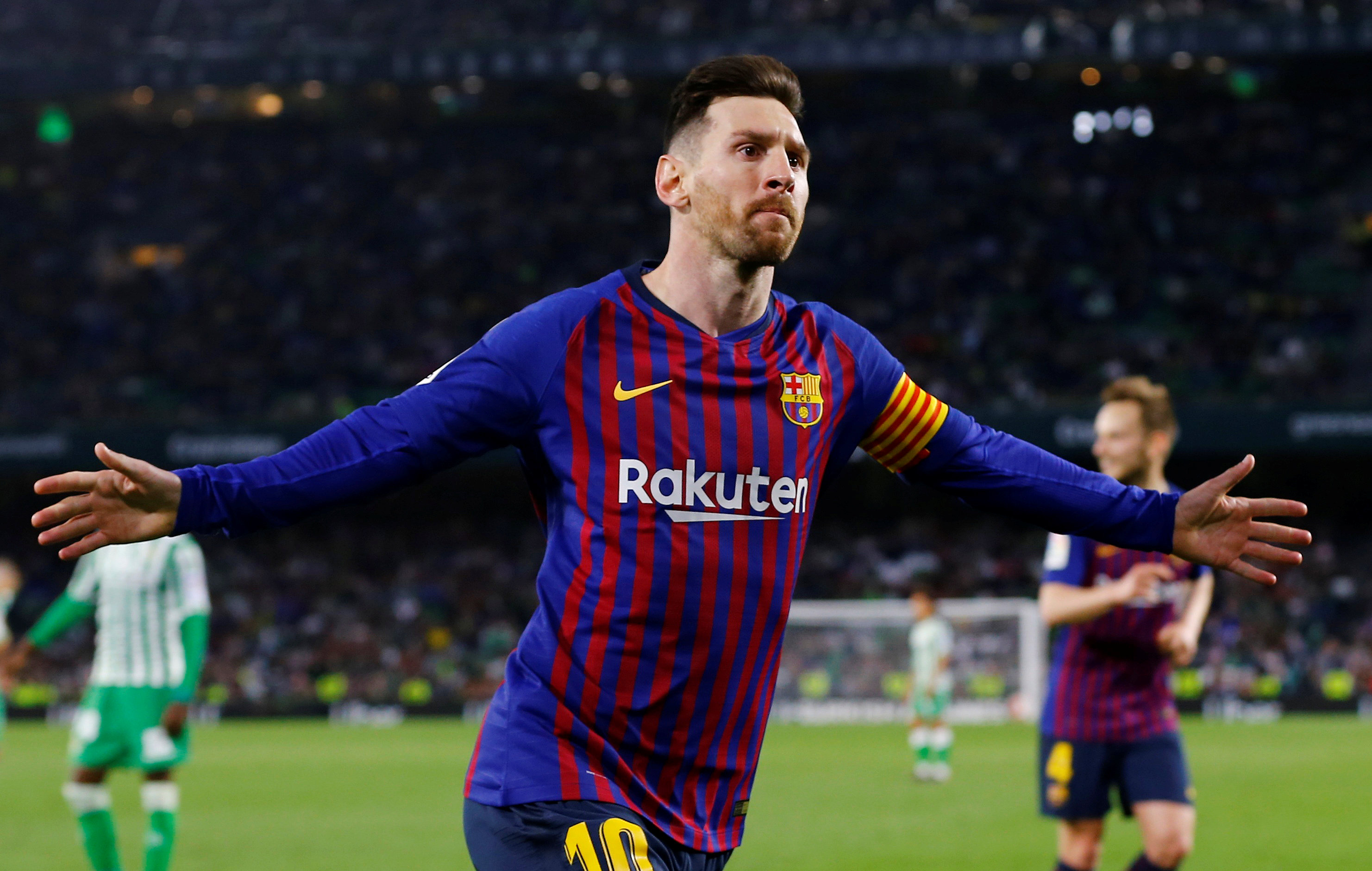 Soccer Football – La Liga Santander – Real Betis v FC Barcelona – Estadio Benito Villamarin, Seville, Spain – March 17, 2019 Barcelona’s Lionel Messi celebrates scoring their fourth goal to complete his hat-trick REUTERS/Marcelo del Pozo