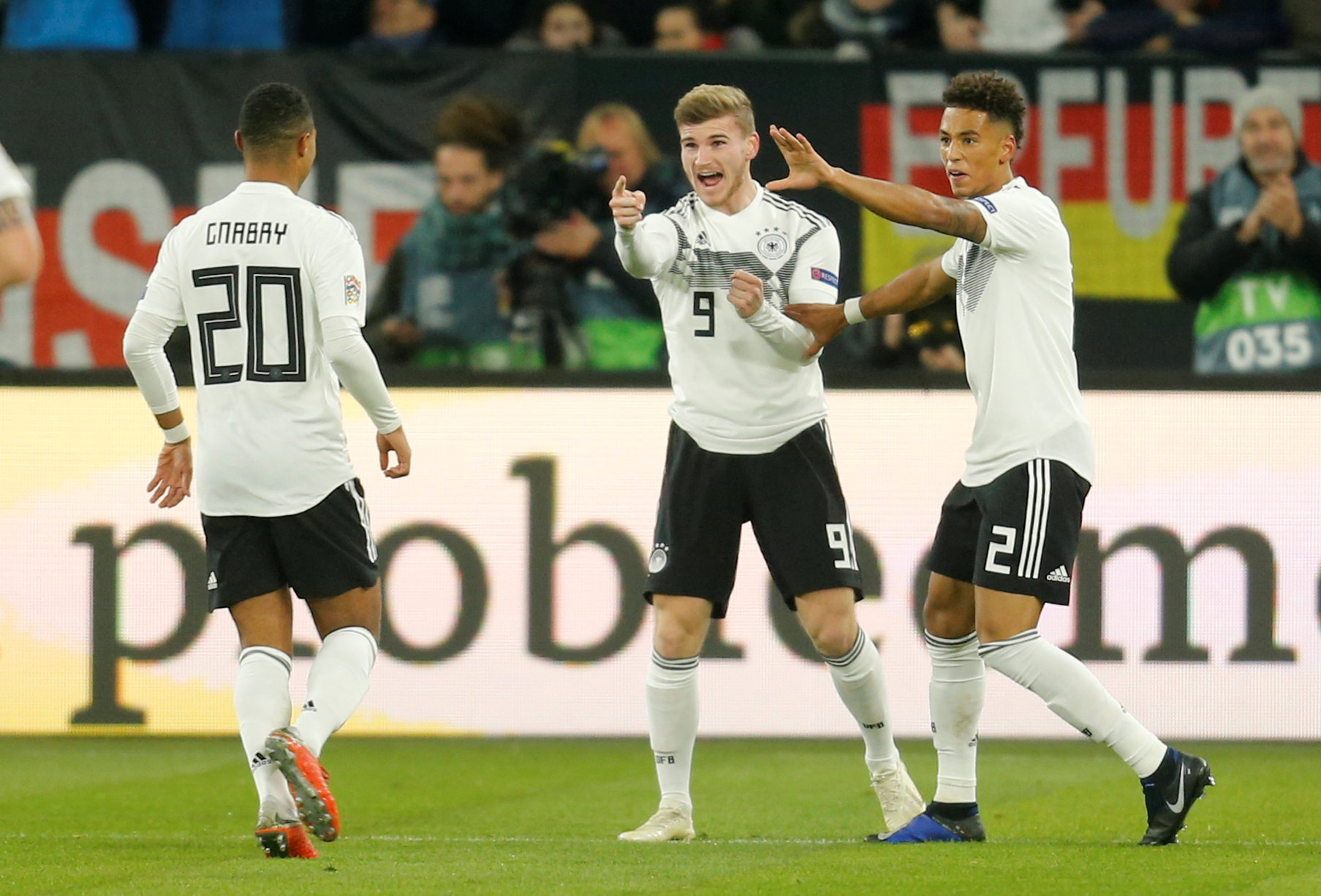 Soccer Football – UEFA Nations League – League A – Group 1 – Germany v Netherlands – Veltins-Arena, Gelsenkirchen, Germany – November 19, 2018 Germany’s Timo Werner celebrates with Serge Gnabry and Thilo Kehrer after scoring their first goal REUTERS/Leon Kuegeler