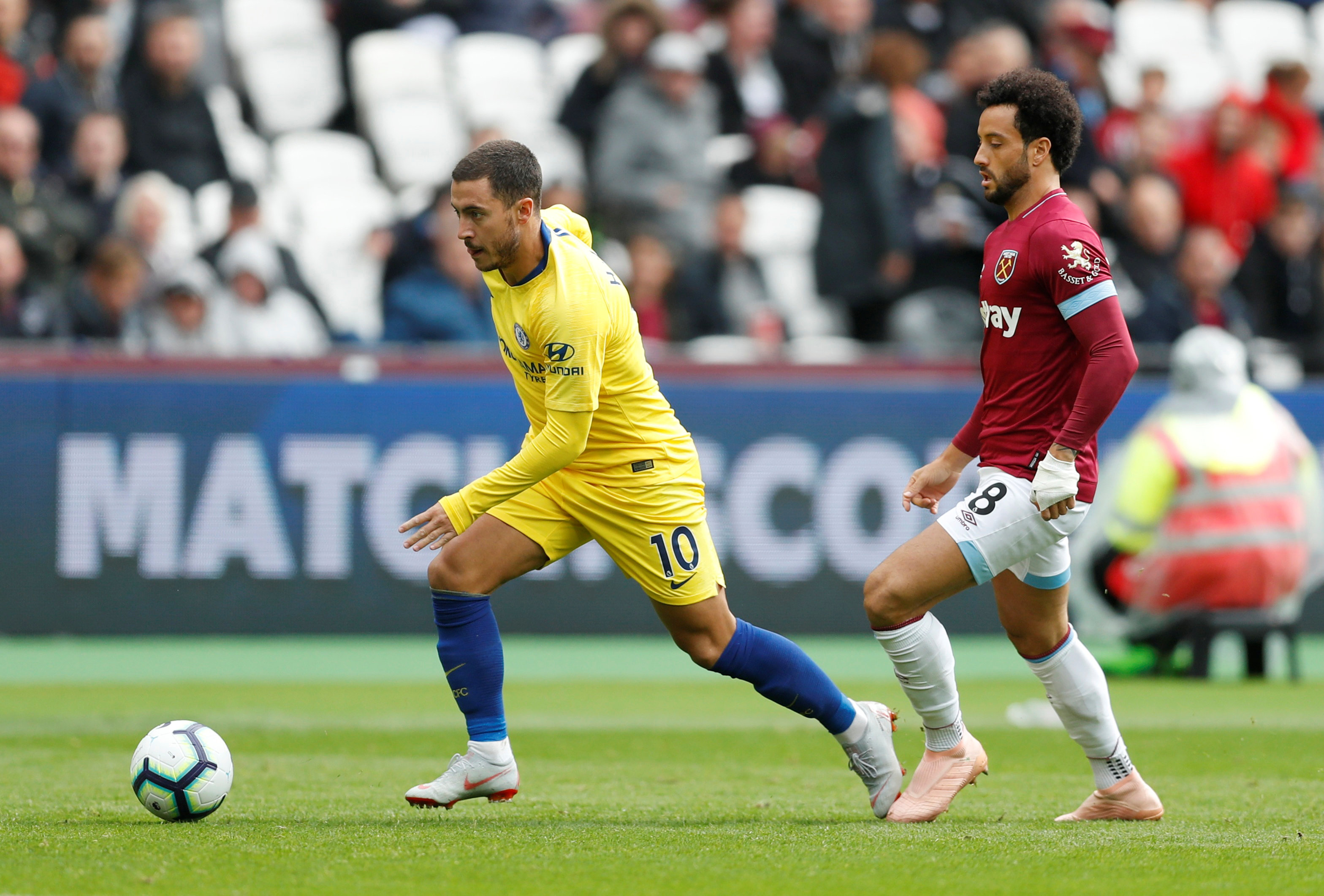 Soccer Football – Premier League – West Ham United v Chelsea – London Stadium, London, Britain – September 23, 2018 Chelsea’s Eden Hazard in action with West Ham’s Felipe Anderson Action Images via Reuters/Matthew Childs EDITORIAL USE ONLY. No use with unauthorized audio, video, data, fixture lists, club/league logos or “live” services. Online in-match use limited to 75 images, no video emulation. No use in betting, games or single club/league/player publications. Please contact your account representative for further details.