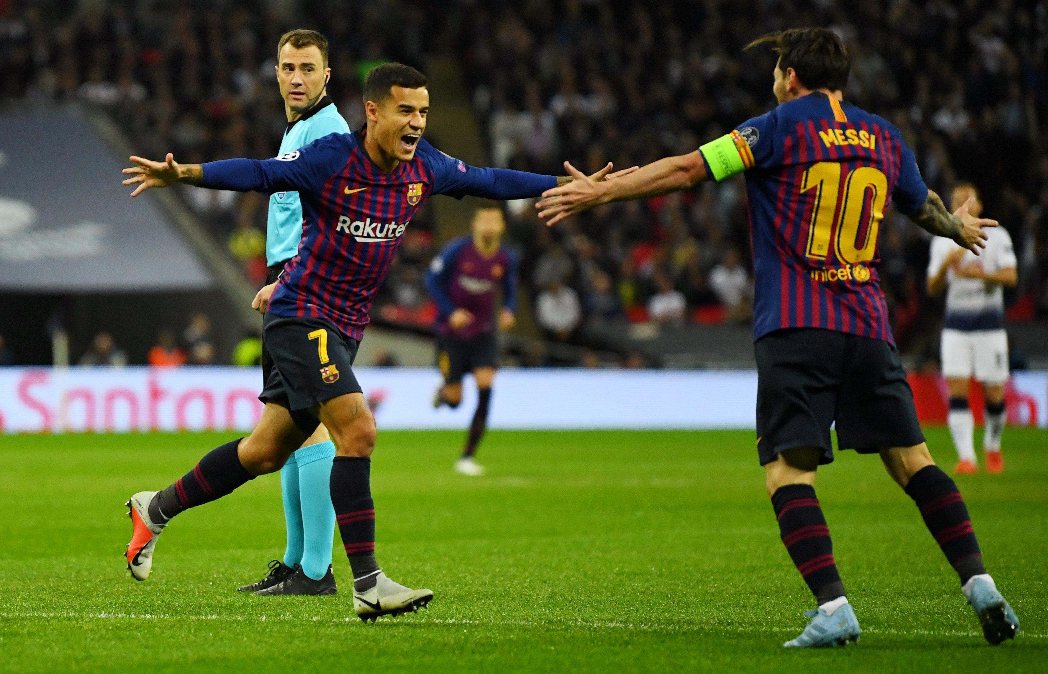 Soccer Football – Champions League – Group Stage – Group B – Tottenham Hotspur v FC Barcelona – Wembley Stadium, London, Britain – October 3, 2018 Barcelona’s Philippe Coutinho celebrates with Lionel Messi after scoring their first goal REUTERS/Dylan Martinez