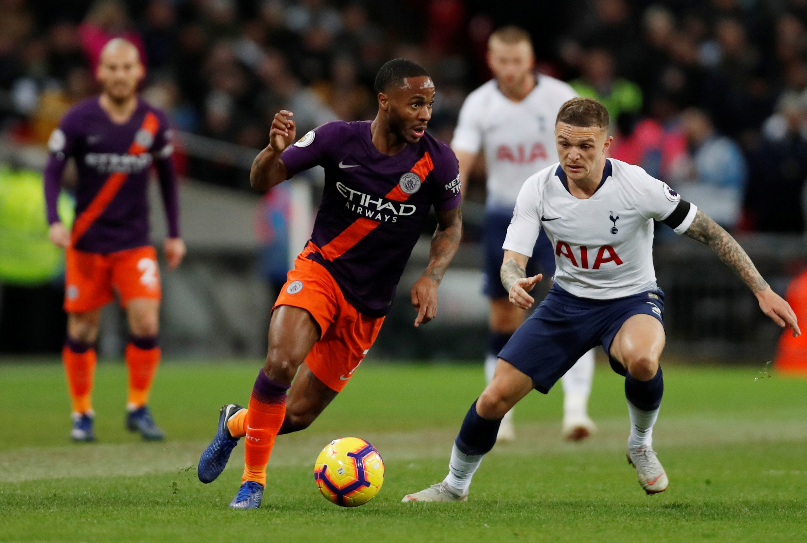 Soccer Football – Premier League – Tottenham Hotspur v Manchester City – Wembley Stadium, London, Britain – October 29, 2018 Manchester City’s Raheem Sterling in action with Tottenham’s Kieran Trippier Action Images via Reuters/Paul Childs EDITORIAL USE ONLY. No use with unauthorized audio, video, data, fixture lists, club/league logos or “live” services. Online in-match use limited to 75 images, no video emulation. No use in betting, games or single club/league/player publications. Please contact your account representative for further details.