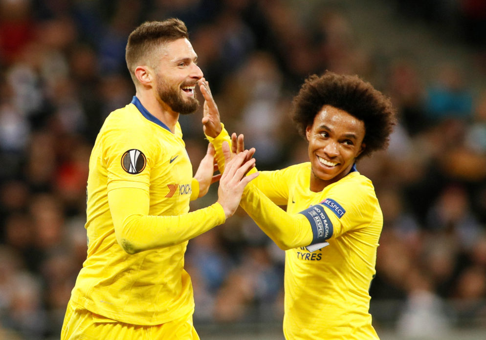 Soccer Football – Europa League – Round of 16 Second Leg – Dynamo Kiev v Chelsea – NSC Olympiyskiy, Kiev, Ukraine – March 14, 2019 Chelsea’s Olivier Giroud celebrates scoring their second goal with Willian REUTERS/Valentyn Ogirenko