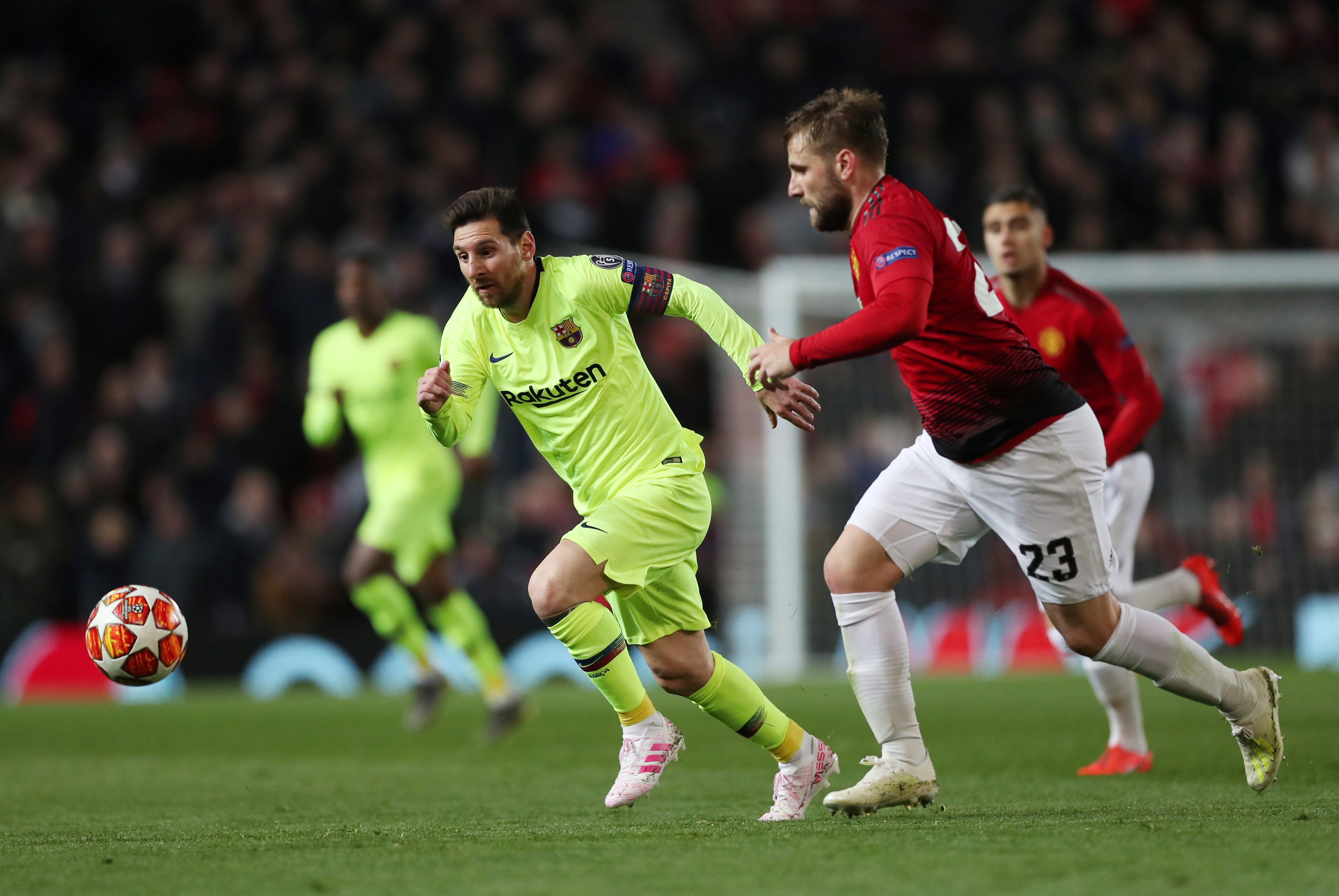 Soccer Football – Champions League Quarter Final First Leg – Manchester United v FC Barcelona – Old Trafford, Manchester, Britain – April 10, 2019 Barcelona’s Lionel Messi in action with Manchester United’s Luke Shaw Action Images via Reuters/Lee Smith
