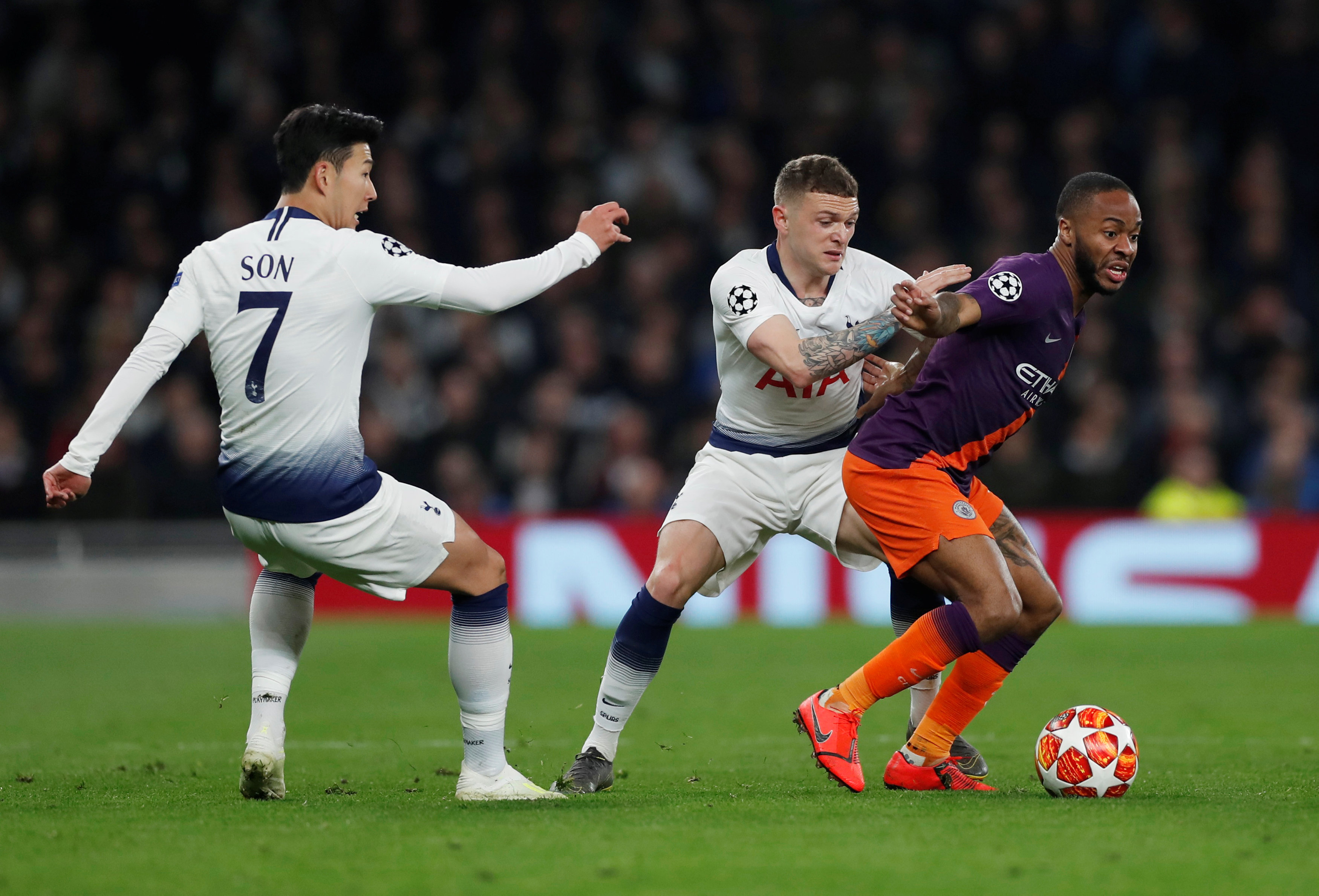 Soccer Football – Champions League Quarter Final First Leg – Tottenham Hotspur v Manchester City – Tottenham Hotspur Stadium, London, Britain – April 9, 2019 Manchester City’s Raheem Sterling in action with Tottenham’s Son Heung-min and Kieran Trippier Action Images via Reuters/Paul Childs