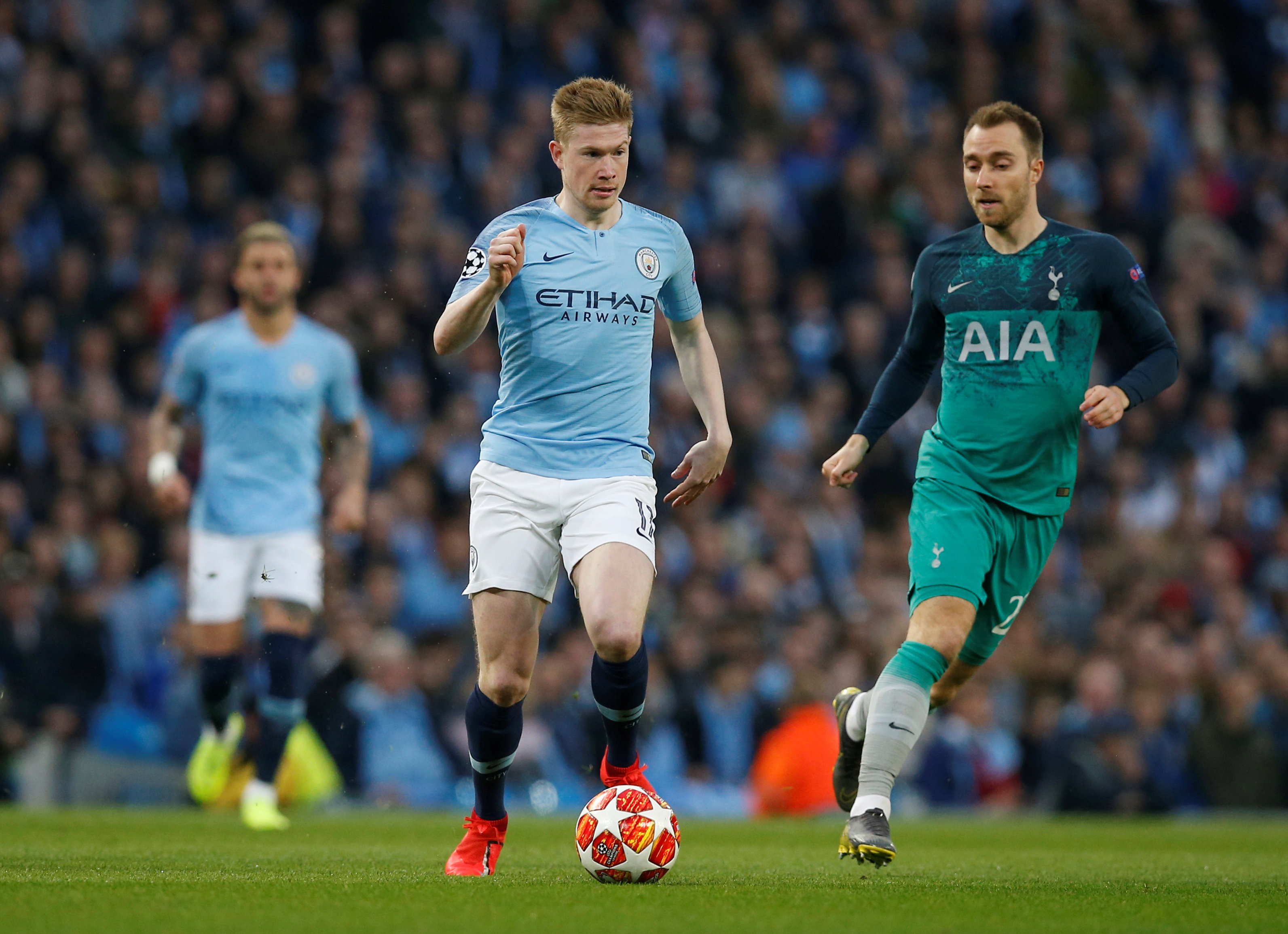 Soccer Football – Champions League Quarter Final Second Leg – Manchester City v Tottenham Hotspur – Etihad Stadium, Manchester, Britain – April 17, 2019 Manchester City’s Kevin De Bruyne in action with Tottenham’s Christian Eriksen REUTERS/Andrew Yates
