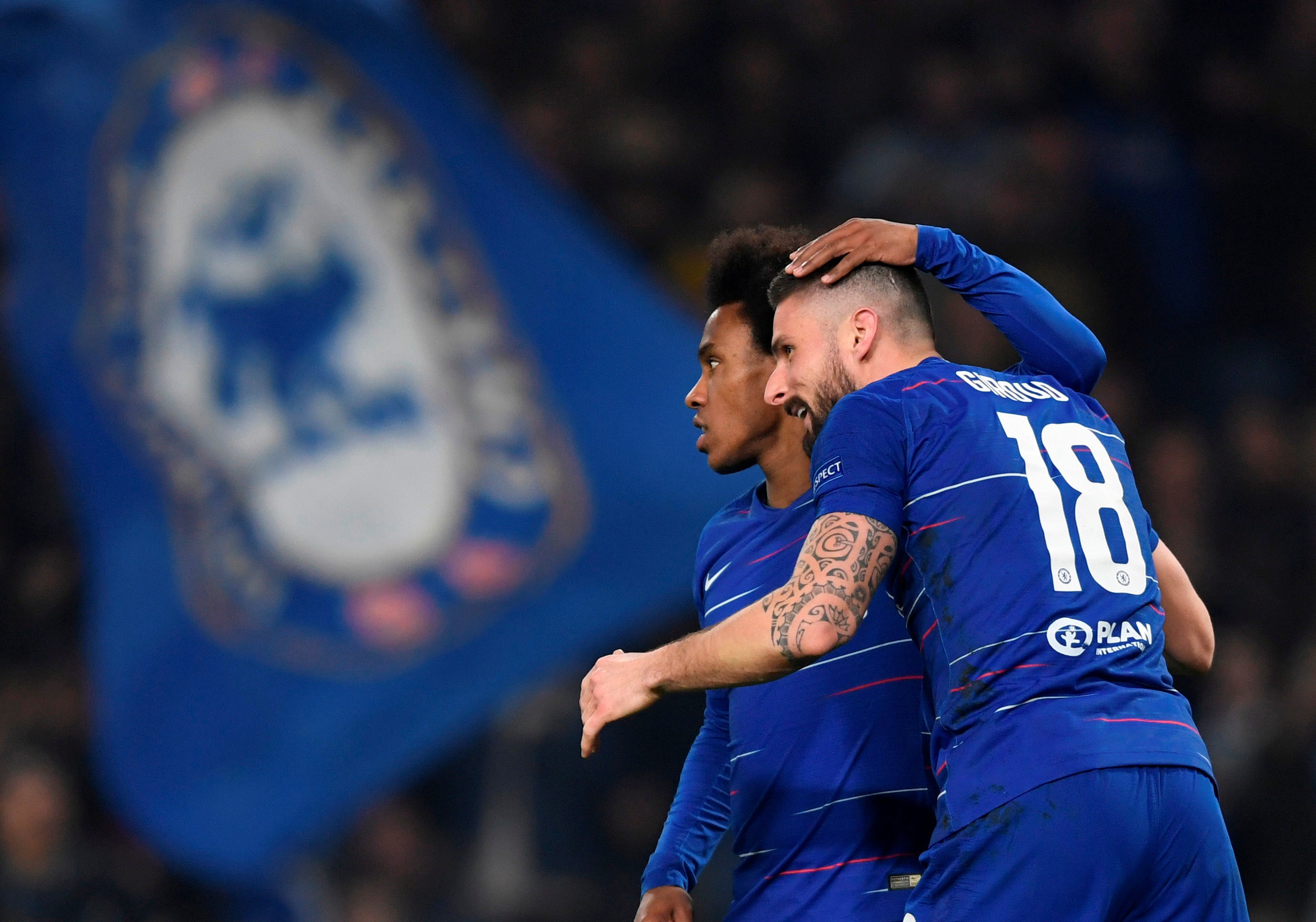 Soccer Football – Europa League – Round of 32 Second Leg – Chelsea v Malmo – Stamford Bridge, London, Britain – February 21, 2019 Chelsea’s Olivier Giroud celebrates scoring their first goal with Willian Action Images via Reuters/Tony O’Brien