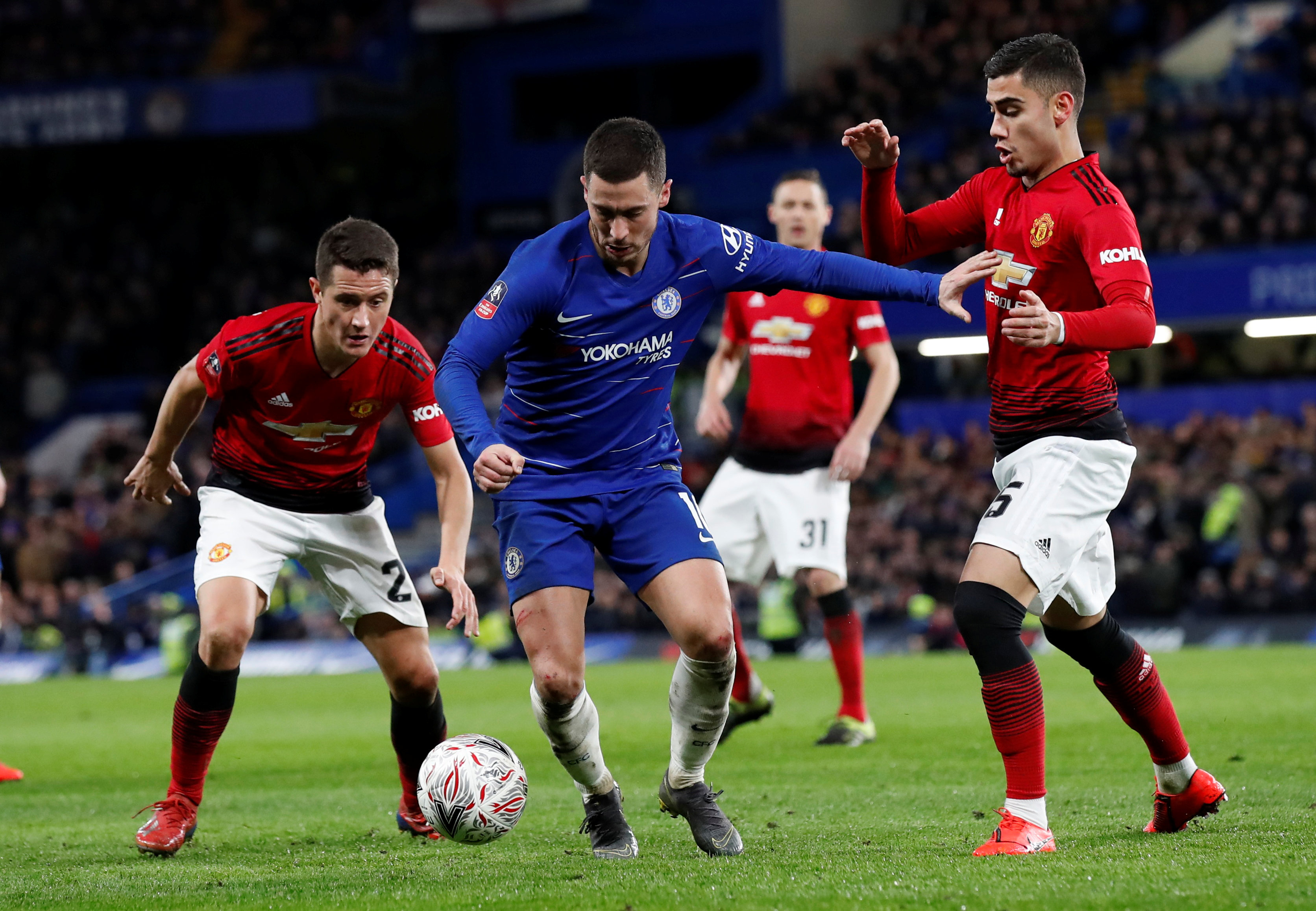 Previous Image FA Cup Fifth Round – Chelsea v Manchester United Soccer Football – FA Cup Fifth Round – Chelsea v Manchester United – Stamford Bridge, London, Britain – February 18, 2019 Chelsea’s Eden Hazard in action with Manchester United’s Andreas Pereira and Ander Herrera REUTERS/David Klein