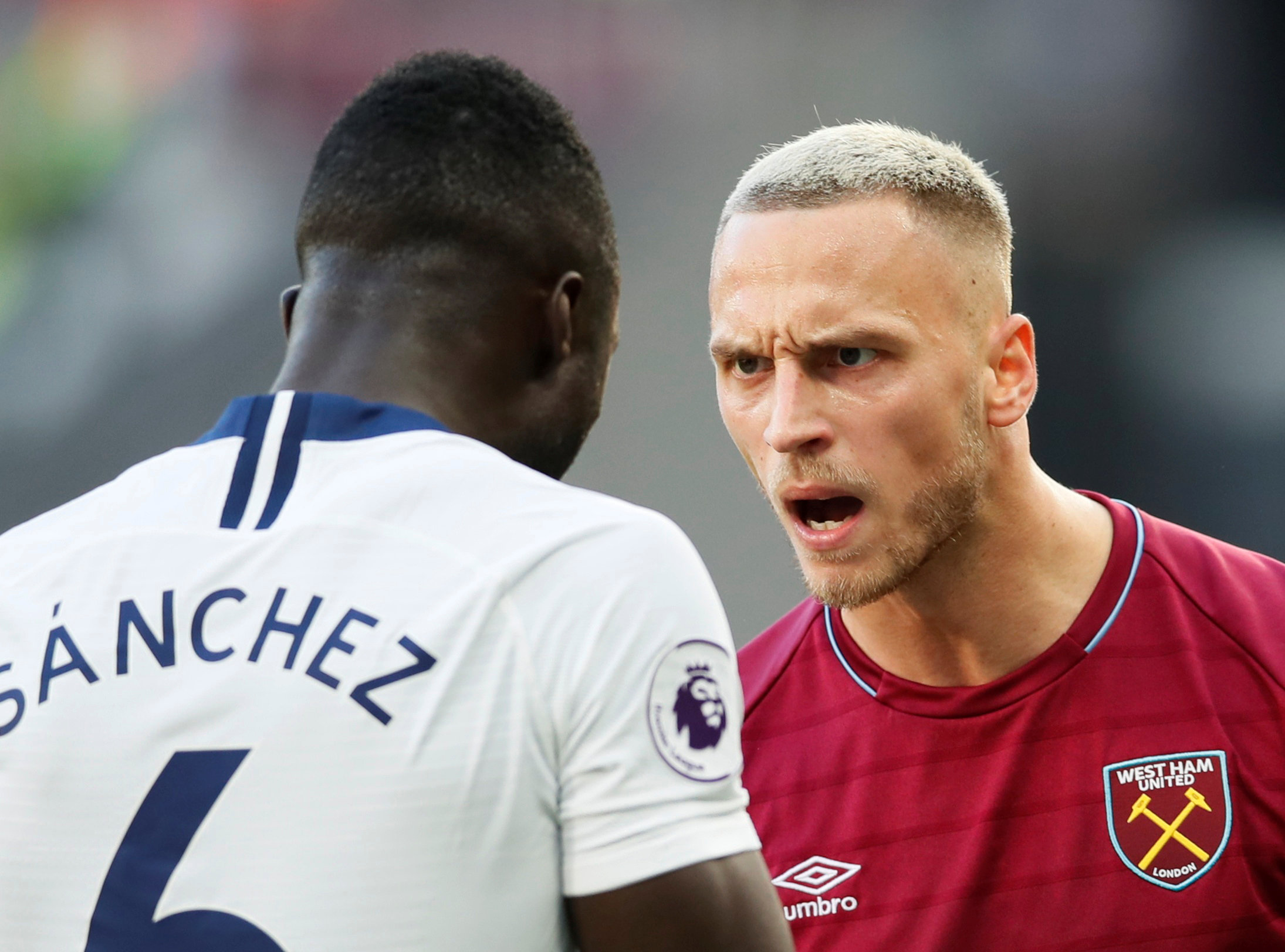 Soccer Football – Premier League – West Ham United v Tottenham Hotspur – London Stadium, London, Britain – October 20, 2018 West Ham’s Marko Arnautovic clashes with Tottenham’s Davinson Sanchez REUTERS/David Klein EDITORIAL USE ONLY. No use with unauthorized audio, video, data, fixture lists, club/league logos or “live” services. Online in-match use limited to 75 images, no video emulation. No use in betting, games or single club/league/player publications. Please contact your account representative for further details.
