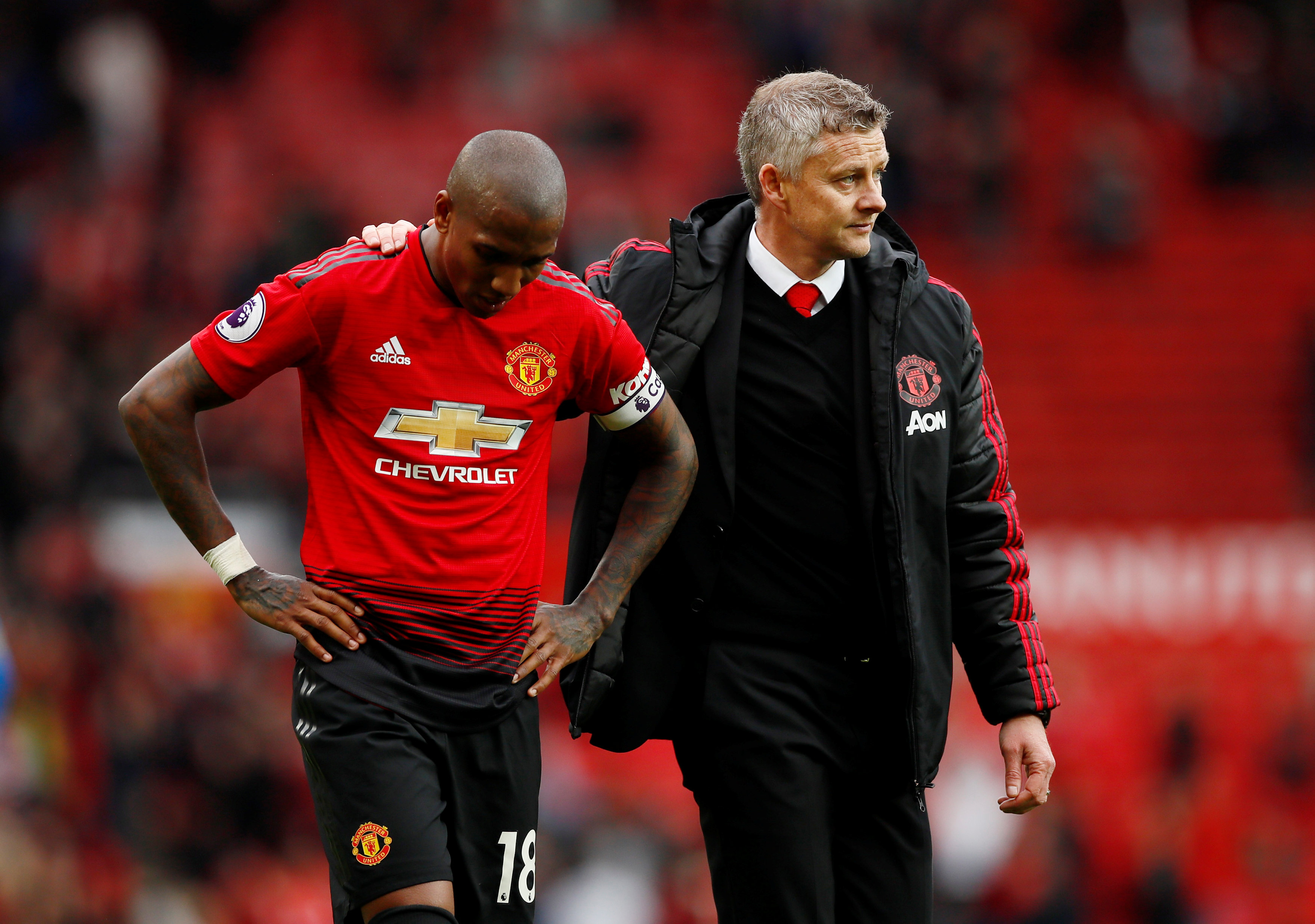 Soccer Football – Premier League – Manchester United v Chelsea – Old Trafford, Manchester, Britain – April 28, 2019 Manchester United’s Ashley Young looks dejected with manager Ole Gunnar Solskjaer after the match Action Images via Reuters/Jason Cairnduff EDITORIAL USE ONLY. No use with unauthorized audio, video, data, fixture lists, club/league logos or “live” services. Online in-match use limited to 75 images, no video emulation. No use in betting, games or single club/league/player publications. Please contact your account representative for further details.