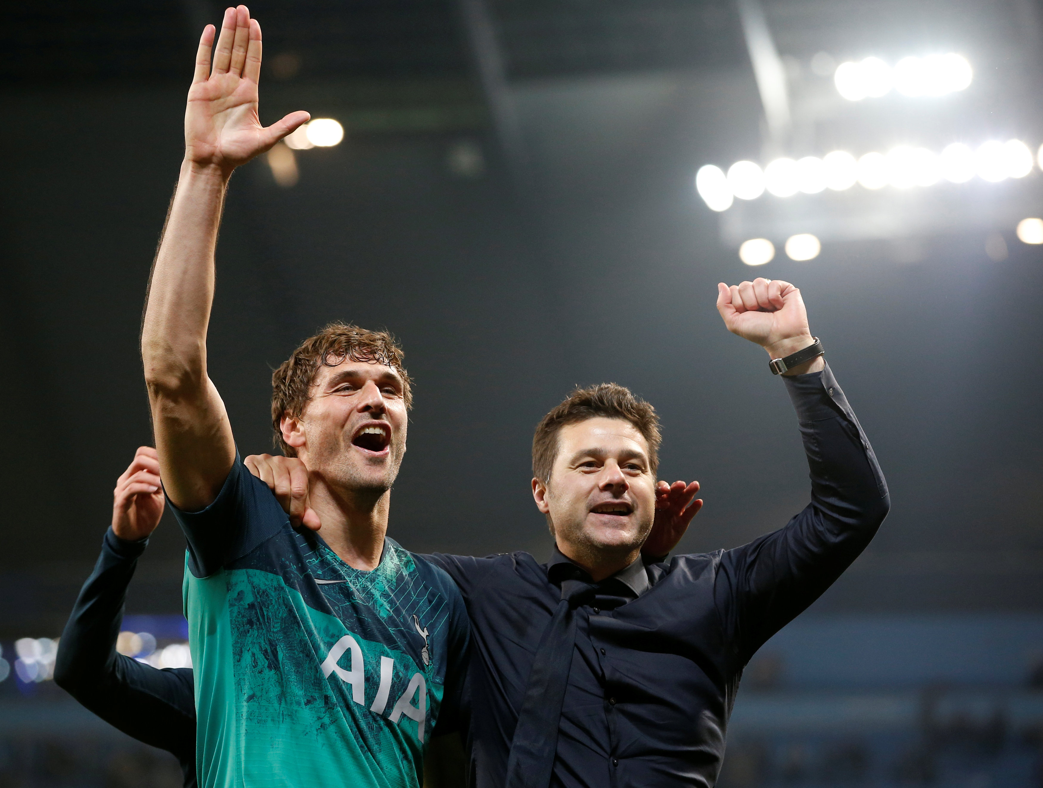 Soccer Football – Champions League Quarter Final Second Leg – Manchester City v Tottenham Hotspur – Etihad Stadium, Manchester, Britain – April 17, 2019 Tottenham manager Mauricio Pochettino and Tottenham’s Fernando Llorente celebrate after the match REUTERS/Andrew Yates