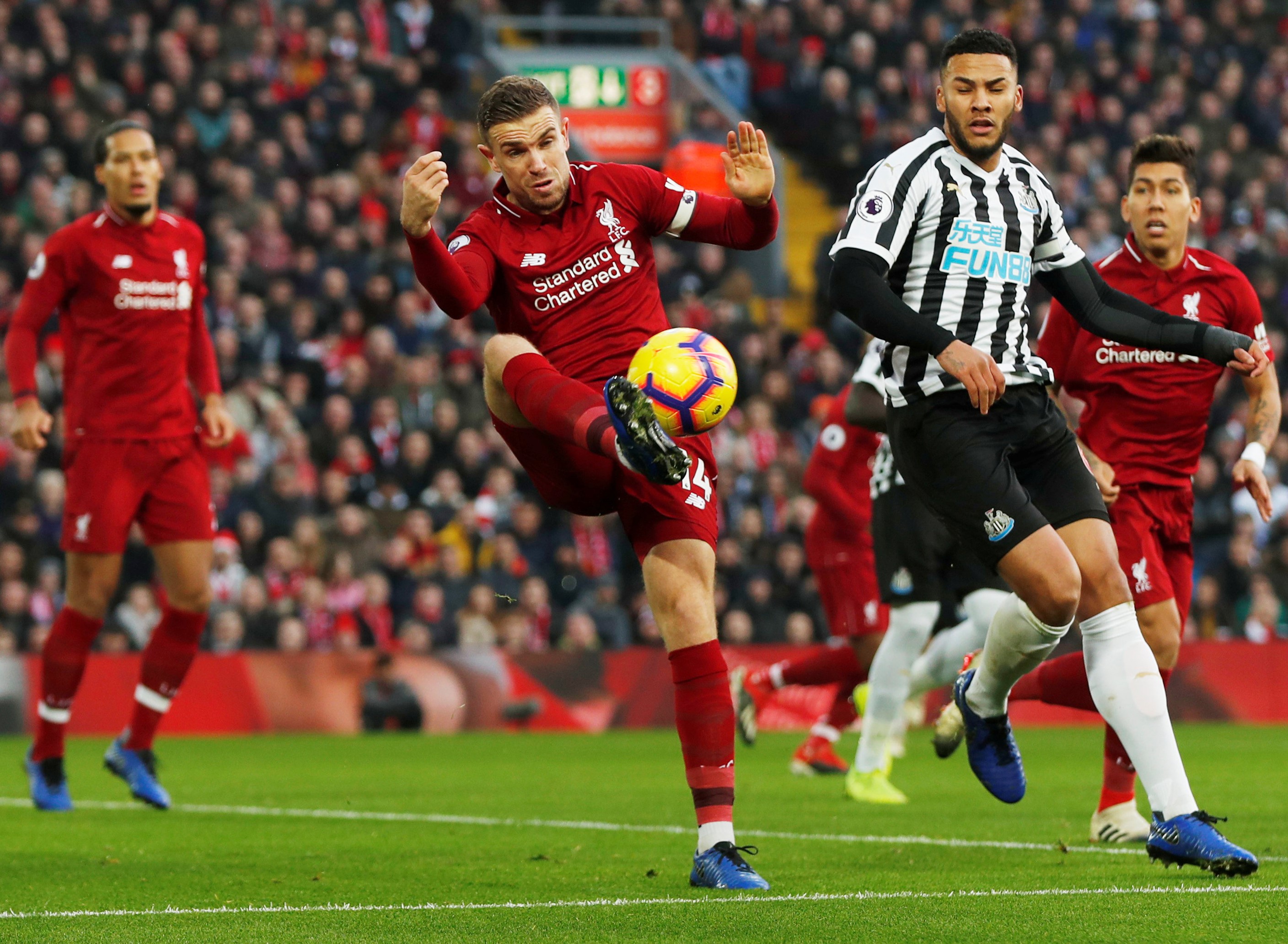 Soccer Football – Premier League – Liverpool v Newcastle United – Anfield, Liverpool, Britain – December 26, 2018 Liverpool’s Jordan Henderson in action with Newcastle United’s Jamaal Lascelles Action Images via Reuters/Lee Smith EDITORIAL USE ONLY. No use with unauthorized audio, video, data, fixture lists, club/league logos or “live” services. Online in-match use limited to 75 images, no video emulation. No use in betting, games or single club/league/player publications. Please contact your account representative for further details.